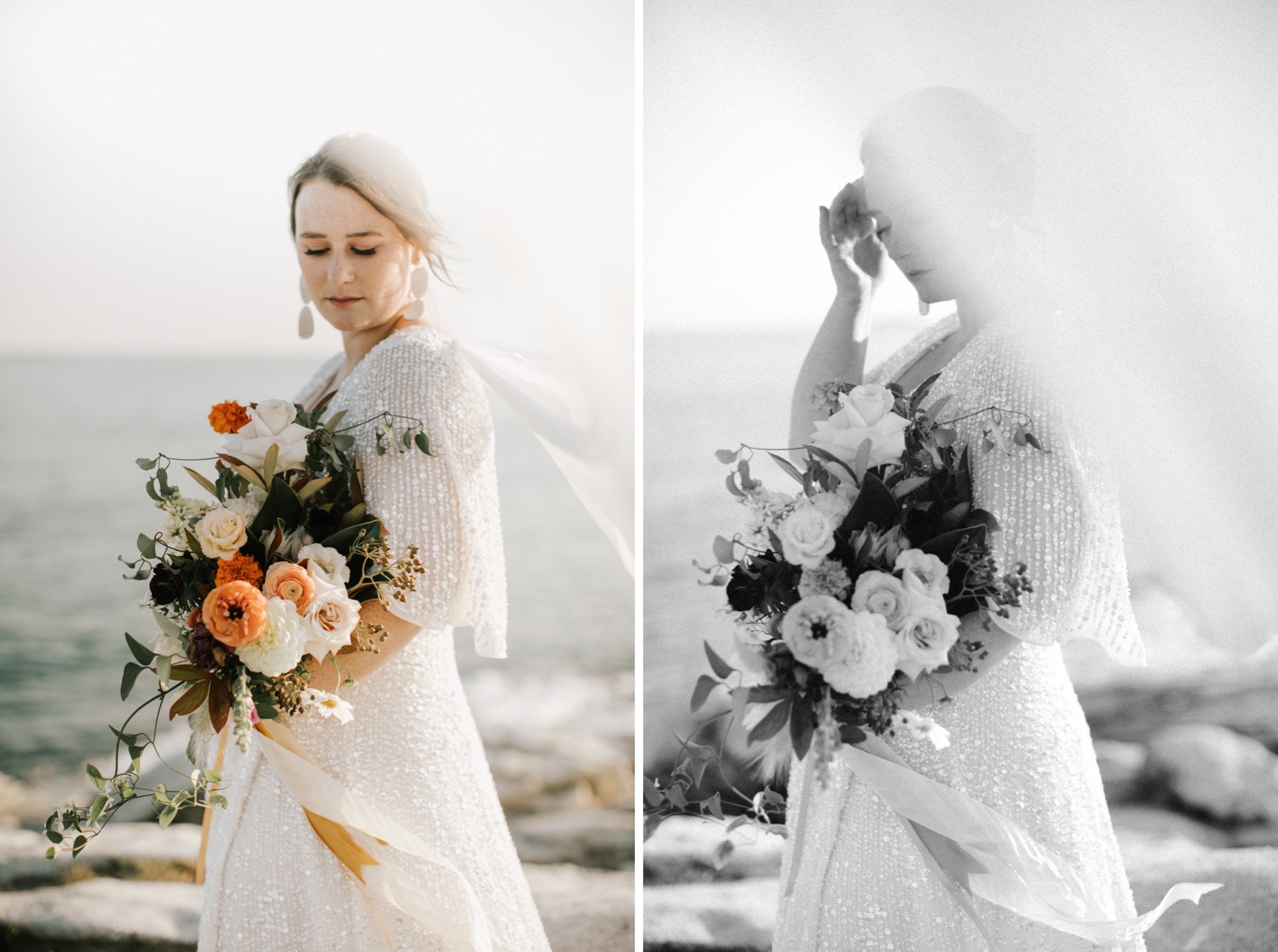 We didn't sleep in separate places the night before. We slept together in our little apartment like we always do with our cats at the foot of the bed. The next morning we drank coffee & tidied up the house, I got my hair done, did my own makeup on the bathroom floor while Stevie sat in the sink. We hopped in the car after our first look & headed to the ocean. Our friend Eric officiated a meaningful & perfect ceremony for us while his wife & our friend Sam was our witness alongside our amazing photographer Jamie. We said our vows, we sobbed, we exchanged rings!